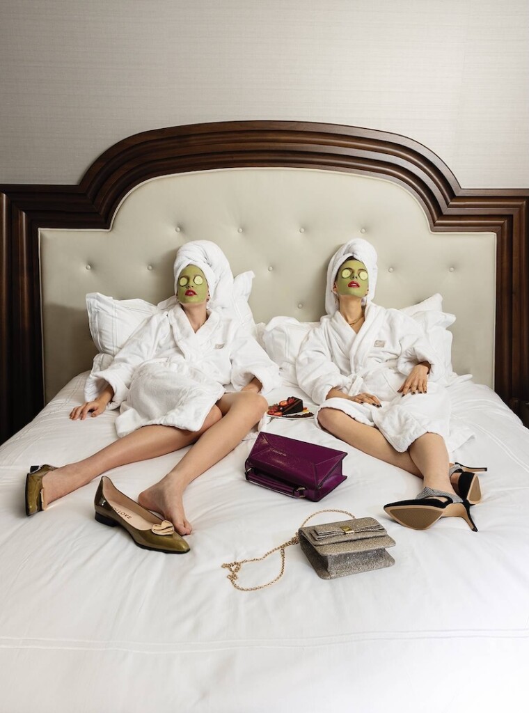 Luxury white terry robes by Fairmont Empress Hotel. Magenta purse by Hispanitas, available at Waterlily Shoes. Purse by Call It Spring, available at Pom Pom Boutique. Green patent flats by Lodi Love and black shoes by Django & Juliette, courtesy of Waterlily Shoes.
