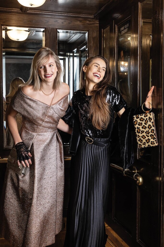 On Chelsie (left): Orange Bruce dress by FRNCH PARIS, gold necklace and earrings by Hackney Nine, all available at Tulipe Noire. Tennis bracelet, available at Pom Pom Boutique. Magenta purse and forest-and-magenta shoes, both by Hispanitas, available at Waterlily Shoes. Lace gloves stylist’s own.