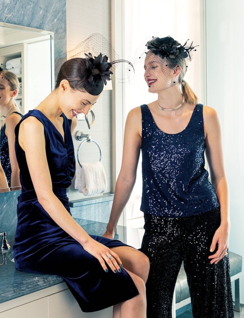 On Chelsie: Sequin top in midnight sail and black sequin pants, both by Part Two and available at Bagheera Boutique. Pearl choker from Pom Pom Boutique. Hackney Nine earrings from Tulipe Noire. Dean Davidson moonstone ring from Provenance Fine Things. Fascinator by KaKyCo, available at Roberta’s Hats.